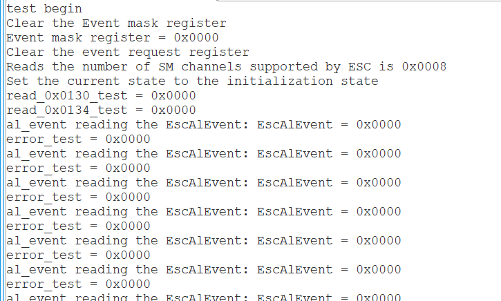 问题来源:在我对ax58100进行初始化完毕后,我便开始循环读取0x0220事件寄存器以等待主站的通信请求,但是在twincat进行通信尝试之后,出现丢包重启从站的情况,但我在zynq调试软件vitis上并未从0x0220预先读取到任何值,也就是主站的通信请求可能并未成功到达ax58100,或者ax58100并未与zynq完成通信,我想先验证zynq与ax58100的通信正确性(以下为vitis内的调试情况