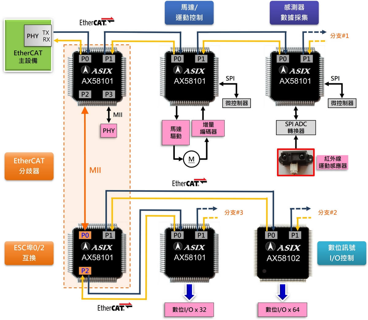 AX58101內建雙高速乙太網路PHY與雙MII介面,並支援ESC埠0/2互換,為多分支EtherCAT網路拓撲設計提供更高靈活性與成本效益。