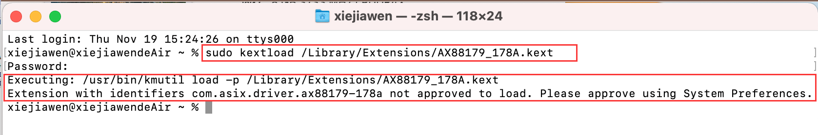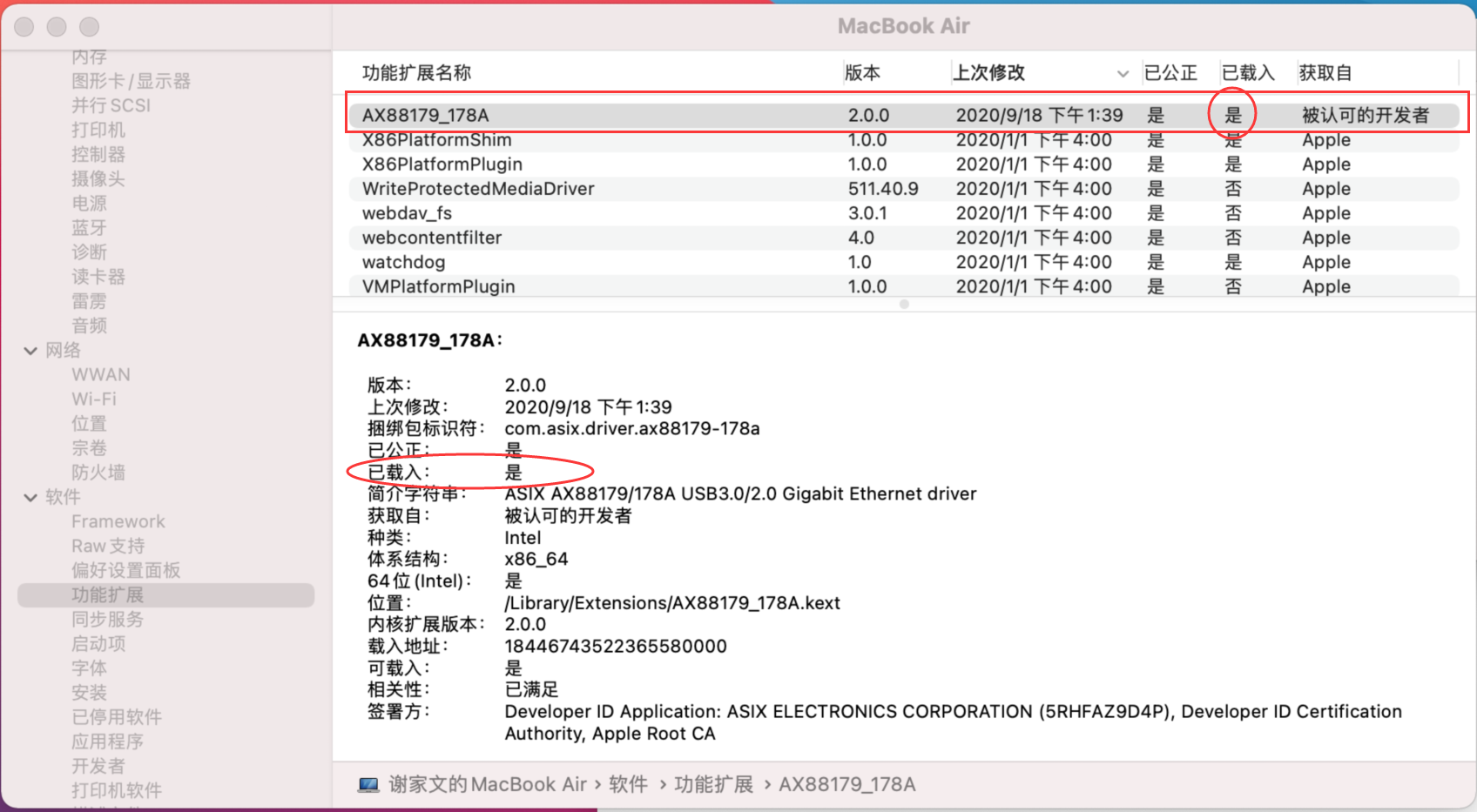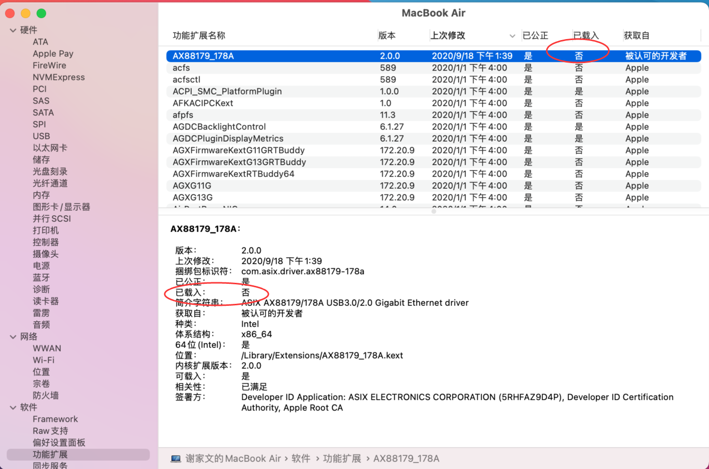 打开终端,输入:sudo kextload /Library/Extensions/AX88179_178A.kext