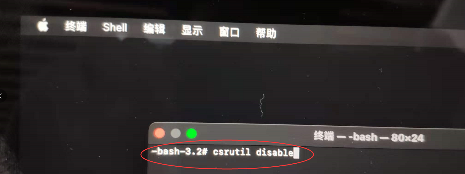 在终端窗口命令行,输入:csrutil disable。回车执行。之后点左上角的苹果图标,重启系统。