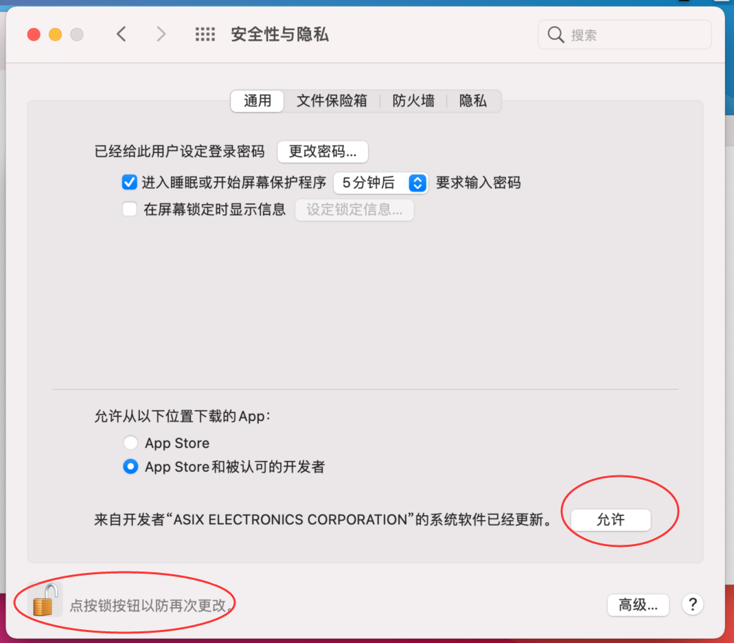 然后到系统偏好设置里面,找到安全性与隐私。解锁,点击允许,之后根据提供,重启系统。