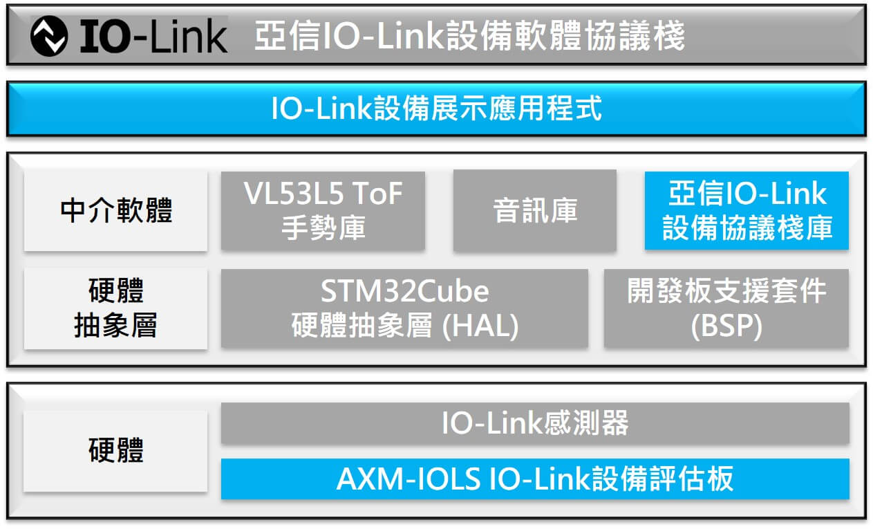 亞信IO-Link設備軟體協議棧是基於亞信電子AXM-IOLS IO-Link設備評估板設計的,搭載意法半導體 STM32F469AI微控制器與L6362A IO-Link設備收發器,並在STM32CubeIDE開發環境中進行開發。此軟體堆疊套件包括亞信IO-Link設備軟體協議棧試用庫、IO-Link感測器驅動程式以及展示應用程式等。