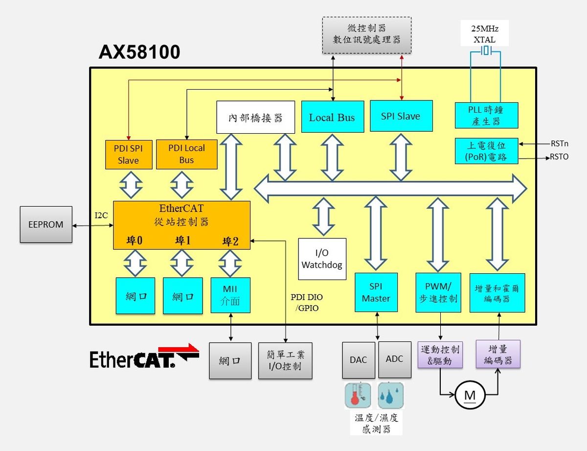 AX58101是一款EtherCAT子設備控制器(ESC),整合了兩個快速乙太網路PHY和兩個MII網路介面,並支援埠0與埠2的互換功能,以滿足靈活的網路拓樸配置需求。此系列控制器支援本地匯流排與SPI Slave製程資料介面(PDI),透過該介面可簡便地與微處理器連接,協助傳統工業設備快速導入EtherCAT功能。同時,具備多樣化的通訊與控制介面,如PWM、ABZ/霍爾編碼器、SPI Master和數位I/O,廣泛適用於各類工業自動化產品應用。